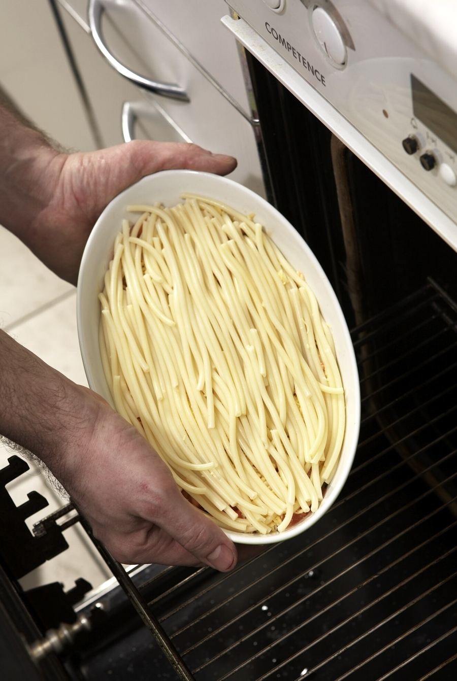 Se strecoară, se trec printr-un jet de apă rece şi se scurg rapid. Apoi, cât sunt călduţe, se toarnă ulei peste ele. Se unge un vas cu ulei, se aşază jumătate din cantitatea de paste, mazărea, şunca şi cuburile de roşii. Se presară cu sare şi piper şi caşcavalul ras şi se acoperă cu restul pastelor.