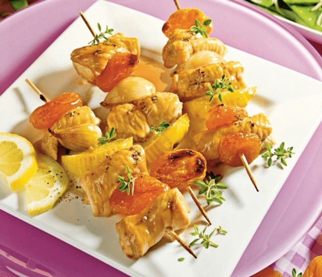 Tai pieptul de curcan în felii subţiri, apoi cureţi ceapa şi o tai în sferturi. Presari carnea cu cimbru, piper şi puţină sare, rulezi feliile de carne şi le înfigi pe beţele de frigărui, alternând cu jumătăţi de felii de lămâie, cai se uscate şi bucăţi de ceapă.