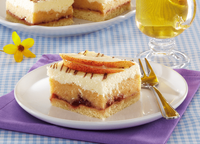 Pentru aluat, baţi untul moale cu zahărul până obţii o cremă. Separat, baţi cu furculiţa ouăle, apoi le adaugi în crema de unt şi mixezi bine compoziţia. Încorporezi făina cernută cu praful de copt. Torni jumătate din aluat într-o tavă tapetată. Adaugi dulceaţă de pere după gust şi torni restul de aluat. Coci prăjitura 50-60 de minute la 180 °C.