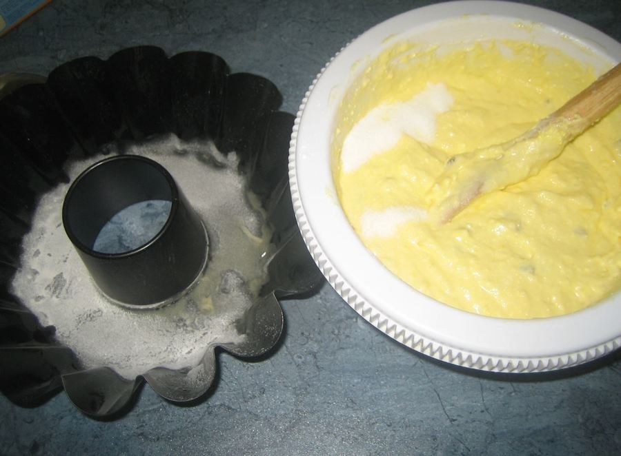 Se unge o formă de tarta care are gaură în mijloc cu ulei, se tapetează cu făină şi se toarnă în ea compoziţia pentru pasca iepuraş.
