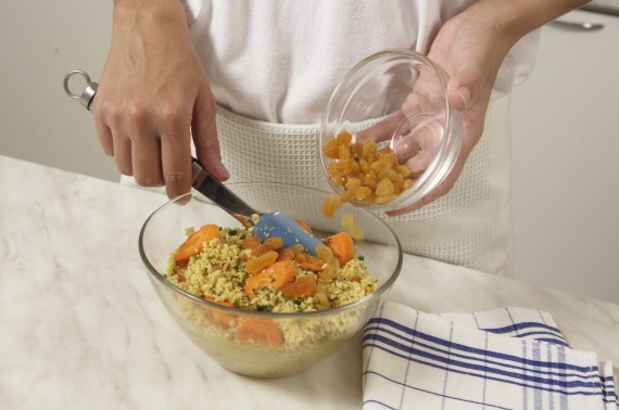 Amesteci cuşcuşul rece cu oul, morcovii tăiaţi felii şi căliţi în unt, pătrunjelul verde tocat şi stafidele înmuiate în prealabil. Condimentezi cu sare şi piper, după gust.
